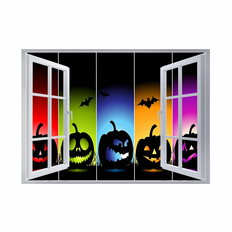 Bring a splash of Halloween fun and vibrant colors to your space with the 5 Pumpkins 3D Hole In The Wall Sticker! This playful and eye-catching design features five charming pumpkins, each with its own unique personality, glowing in a variety of bold colors—red, green, blue, orange, and purple. Their mischievous expressions add a touch of spooky joy, making them perfect for any Halloween or autumn-themed decor. Above them, dark silhouettes of bats soar through the sky, enhancing the festive and magical atmosphere. The combination of vivid hues and Halloween charm makes this sticker a standout addition to any room.