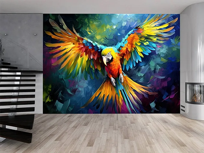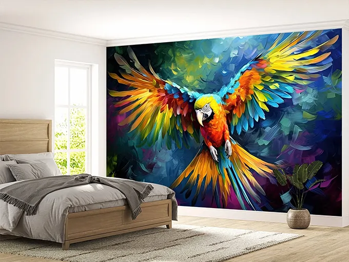 Designed for those who love bold décor and nature-inspired aesthetics, the Colorful Parrot Wallpaper pairs beautifully with wooden furnishings, rattan accents, tropical plants, warm lighting, and bohemian or coastal interior styles. It works wonderfully as a feature wall in bedrooms, living rooms, playrooms, or any area that would benefit from an exotic, cheerful touch. Whether your style leans vibrant and eclectic or calm and tropical, this mural adds personality and tropical radiance to your space.