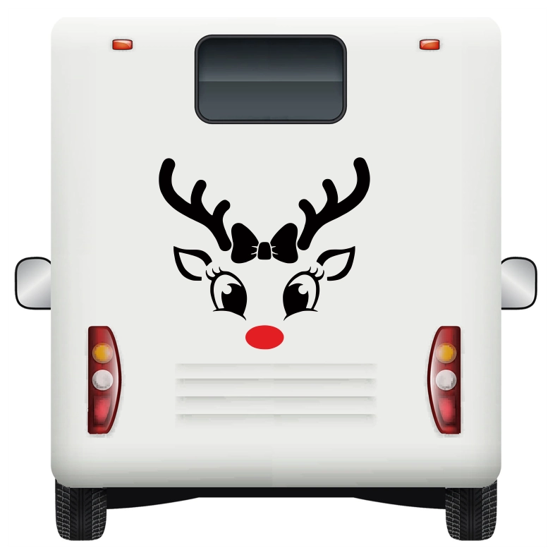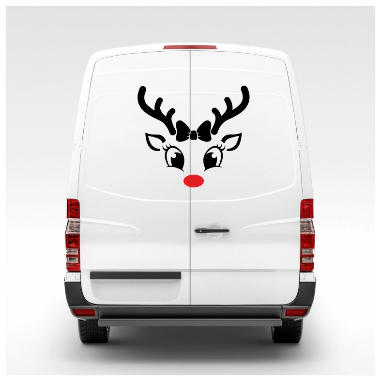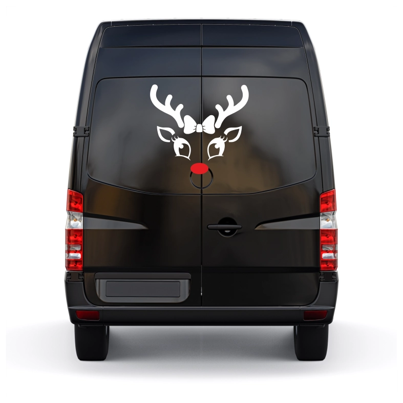 The decal showcases the gentle and expressive features of the reindeer girl — big sparkling eyes, soft curves, and her iconic red nose that enhances her winter charm. The precise contur-cut outline gives the sticker a clean, seamless appearance without a background, allowing it to blend beautifully with car surfaces such as windows, doors, or panels.