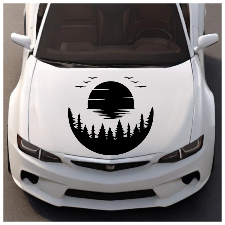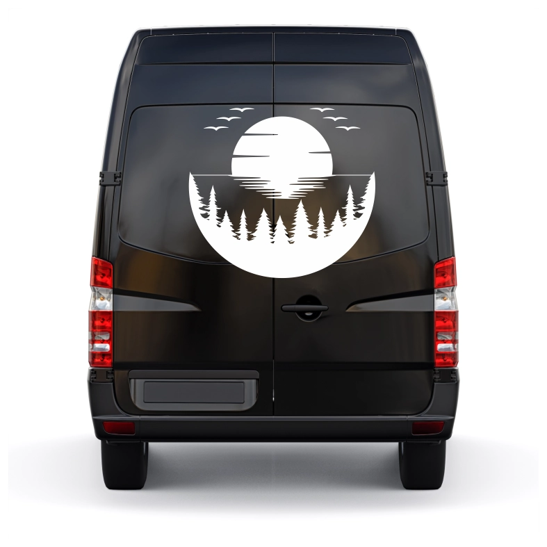 The circular shape represents harmony and continuity, while the forest and sun evoke stillness, freedom, and a deep connection to nature. The contrast between the bold tree silhouettes and the smooth reflection on the water adds depth and visual interest. Subtle details such as the birds in flight introduce gentle movement, giving the design a calm yet dynamic feel. This decal works perfectly as a focal detail on a rear window, door, hood, or side panel, adding a natural and thoughtful character to your vehicle.