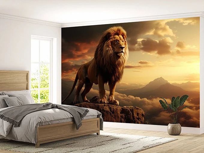 Enhance your bedroom with the Majestic Lion Wall Mural Wallpaper. Let your walls reflect the beauty, confidence, and untamed spirit of the wild.