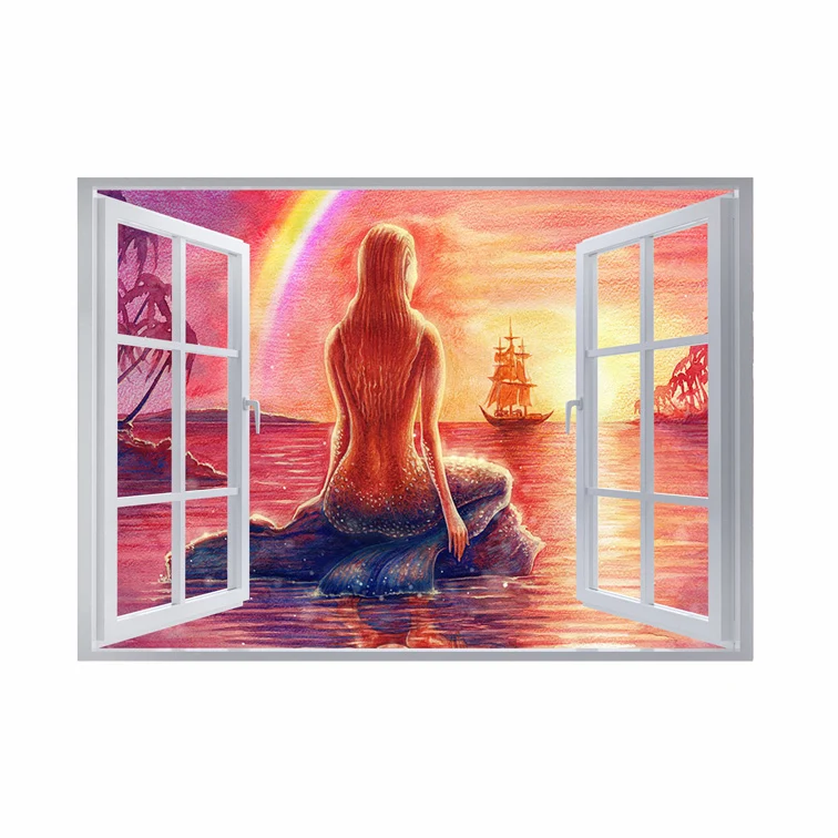 Immerse yourself in the enchanting world of the sea with the Mermaid and Sunset 3D Hole In The Wall Sticker. This breathtaking design captures a mesmerizing moment—a mystical mermaid sits gracefully on a rugged rock, gazing at the golden hues of the setting sun. The warm glow reflects on the gentle waves, painting the scene in dreamy shades of amber, pink, and violet. In the distance, a majestic sailing ship glides across the horizon, while a delicate rainbow arches across the sky, adding a touch of magic.