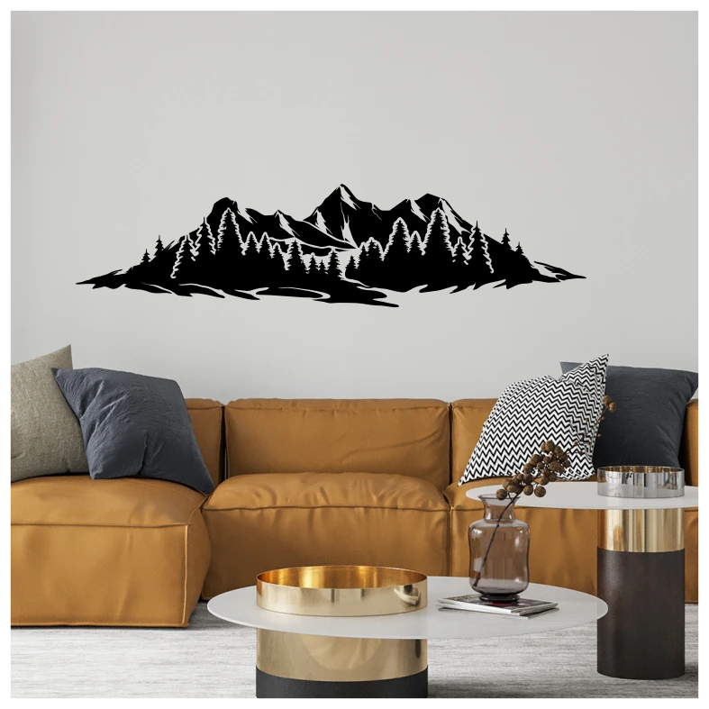 The horizontal composition of mountains and forest creates a sense of openness and space, making rooms feel wider and more connected to nature. Sharp mountain peaks symbolize strength and freedom, while the layered pine trees add warmth and grounding energy. The silhouette style keeps the design bold and timeless, allowing it to blend seamlessly with modern, Scandinavian, rustic, and industrial interiors. Whether used above a sofa, bed, desk, or along a hallway wall, this decal delivers a calm yet powerful visual impact.