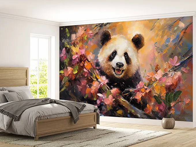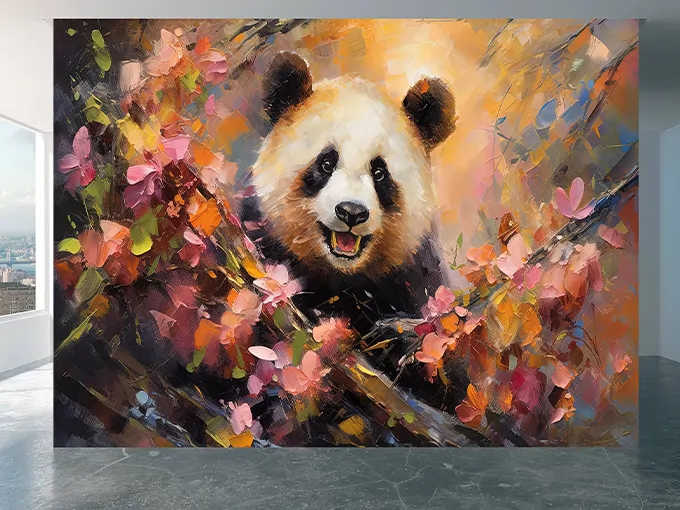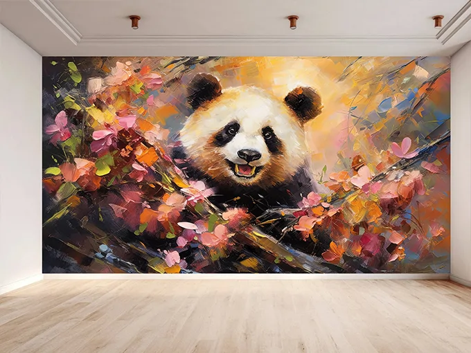 The Painted Panda Mural showcases a beautifully stylized panda brought to life through painterly textures and flowing color transitions. The gentle expression of the panda combined with artistic brush strokes creates a balanced composition that feels calming, friendly, and visually engaging. The painted effect adds depth and originality, making the mural feel like a hand-crafted artwork rather than a simple wallpaper.