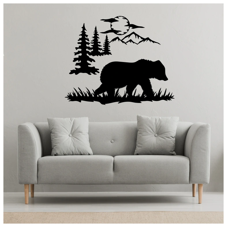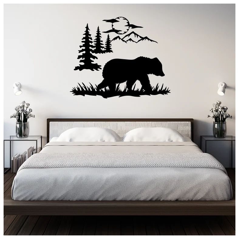 The bear, a universal symbol of power and resilience, is captured in a calm, grounded pose that conveys confidence and balance rather than aggression. Surrounding elements such as evergreen trees, distant mountains, and the moon add depth and atmosphere, evoking the feeling of a peaceful night in the wild. The minimalist silhouette approach keeps the design bold yet elegant, making it suitable for both rustic and modern interiors. This decal works beautifully as a statement piece or as part of a larger nature-inspired décor.