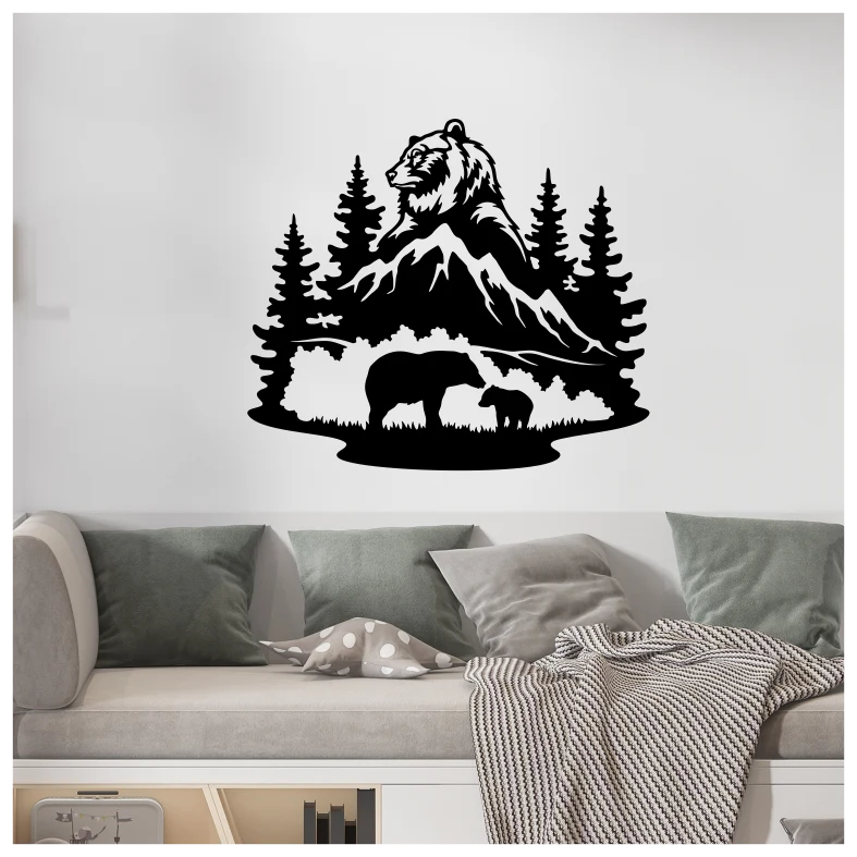 A Stunning Scene of the Wilderness: The Wildlife Bear Forest Wall Decal brings the wild outdoors into your room, portraying the powerful bond of a bear family. The detailed design highlights the protective nature of the father bear, standing tall above the serene mother and her playful cub, all set against a lush forest and majestic mountain peaks. This decal captures the raw beauty of wildlife and is perfect for any room where you want to feel connected to nature.