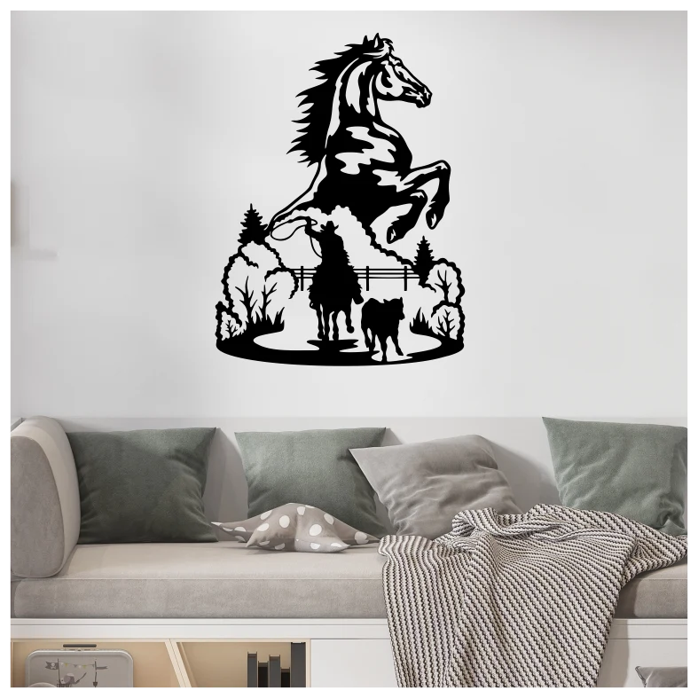 Captivating Western Imagery: The detailed depiction of the cowboy in action, the bull, and the majestic horse standing tall on its hind legs, captures the essence of life on the open plains. This decal not only adds a sense of movement and energy to any room but also evokes feelings of adventure, bravery, and freedom. It’s more than just decoration; it’s a statement of your love for the wild and untamed.
