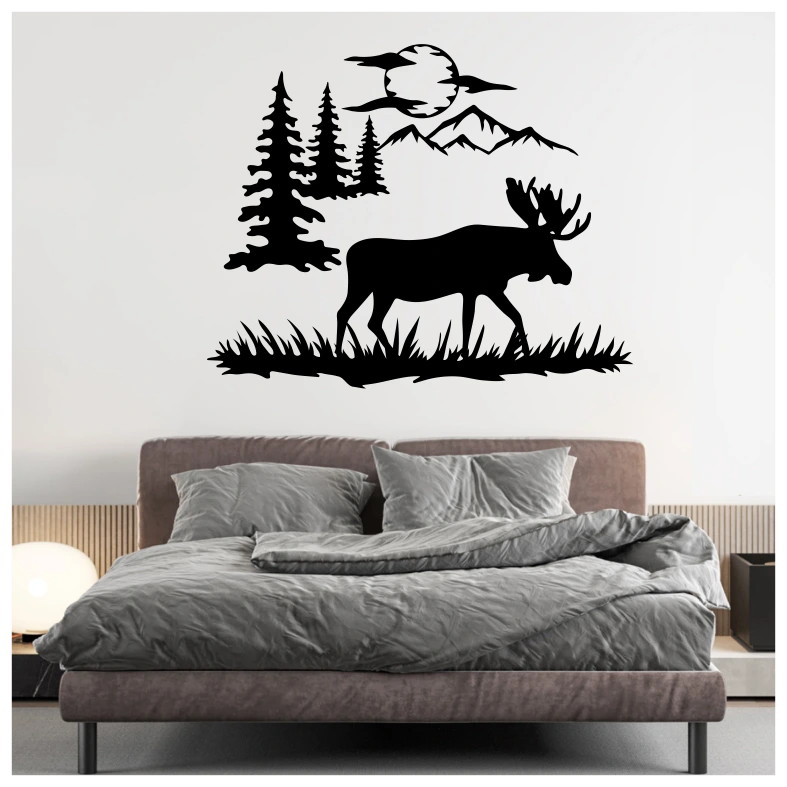 The moose is a powerful symbol of endurance, independence, and quiet confidence. Depicted in a steady, composed stride, it conveys calm strength rather than aggression. The surrounding forest and distant mountains add depth and a sense of space, while the moon overhead enhances the tranquil, nocturnal mood of the scene. The minimalist silhouette approach keeps the design bold and readable from a distance, making it suitable for both modern and rustic décor styles. Whether used as a statement piece or as part of a larger nature-inspired arrangement, this decal brings authentic wilderness energy into your space.