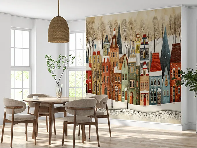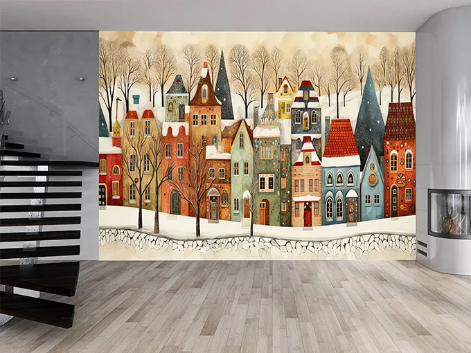 Designed for those who love nostalgic charm and cozy aesthetics, the Winter Vintage Town Wallpaper pairs perfectly with rustic wood tones, warm textiles, vintage-inspired furniture, holiday décor, or traditional interior styles. Whether used as a feature wall in your living room, entryway, dining area, or reading nook, this mural adds a touch of timeless elegance and winter magic to your home. It’s ideal for creating a welcoming, festive atmosphere during the holidays—or for enjoying year-round charm.
