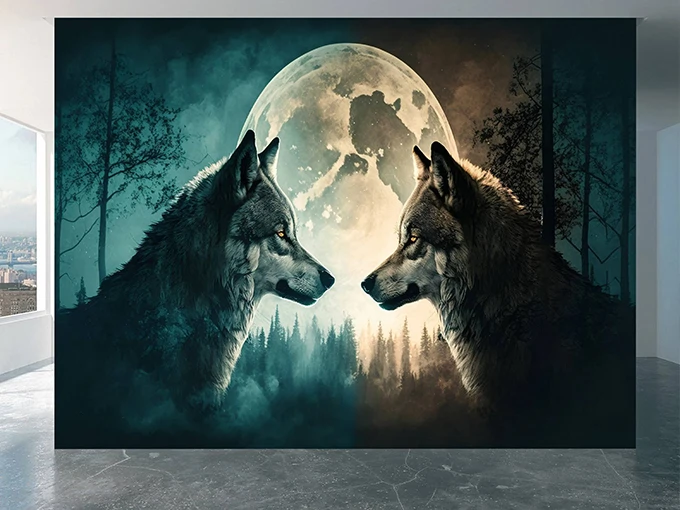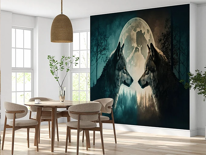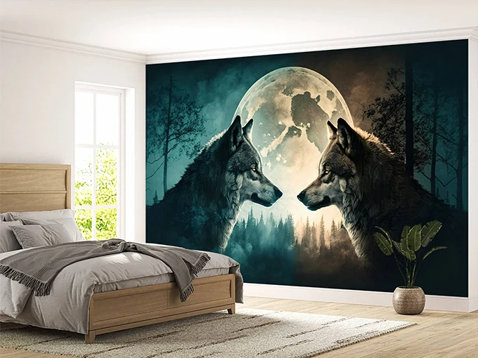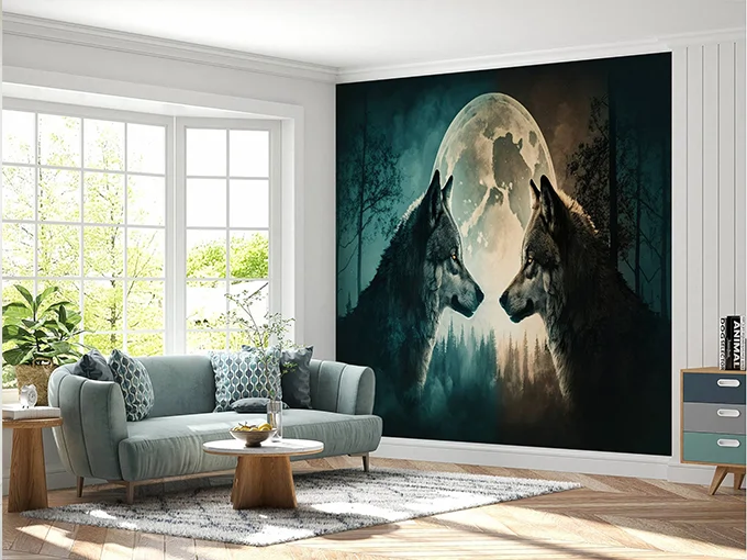 Designed for those who appreciate strong, nature-centered aesthetics, the Wolves Moonlight Wallpaper pairs beautifully with rustic woods, dark-toned décor, metallic accents, textured fabrics, and modern minimalist furniture. It creates an unforgettable focal point—perfect for living rooms, entertainment spaces, bedrooms, or creative studios. Whether your style leans cozy cabin, contemporary chic, or adventurous and bold, this mural enhances the space with drama and natural allure.