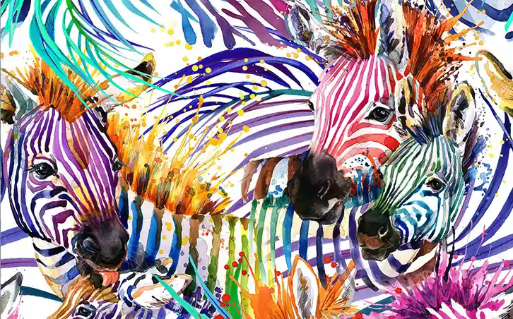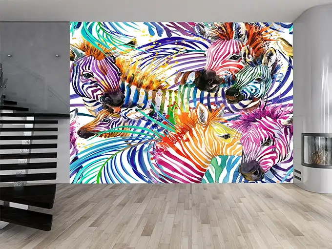The Zebra Pattern Mural reimagines traditional animal print with a fresh, colorful twist. The iconic zebra stripes flow across the wall, enhanced by vivid splashes of color that add depth, movement, and artistic flair. Each stroke feels energetic and intentional, giving the mural a modern, gallery-inspired appearance. Ideal for living rooms, creative spaces, studios, or feature walls, this mural creates an atmosphere that’s both playful and sophisticated.